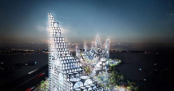 معماران ژاپنی سو فوجیموتو ایده ی خود را در آخرین ساختارشان فاش کردند. یک دسته ی پیچیده از طاق های انباشته شده توسط مجموعه ای از آبشارها بر روی هم قرار گرفتند. این برج یک مجموعه ی تجاری و رصد خانه ای را با هم ترکیب کرده است. از دریا در خاورمیانه ی ناشناس( در دوحا، قطر،اما یک درخواست برای تأیید از شرکت فوجیموتو بدون جواب مانده است ) قابل تشخیص است. سطح پایینی سوق میراج/ پارتیکلز مجموعه ی تجاری است، که شامل خرده فروشی، فضای مسکونی و اداری، دهلیز، حیاط و یک میدان سبز می باشد.