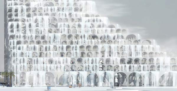 در اینجا طیف گسترده ای از آبشارهای کوچکتر در بالا به منظور جلوگیری از هر گونه مداخله ی باد و بخش های بزرگتر به سمت پایین در تولید خنک کننده های تبخیری در نظر آمده اند.همانطور که معمار بیان می کند: کارآمدی این نوع روش تهویه مطبوع در اقلیم گرم بیابانی ناگفته مانده، اما این ایده ی بزرگی است. آثار فوجیموتو غالباً گشوده با سازه های شفاف مانند پاویون باز شبکه مانند او در لندن یا خانه ی دورافتاده ی عمومی که در ایکی هارای ژاپن طراحی شده، شاخص شده اند. همراه با غباری از آبشارها شفافیت مازاد طاق های انباشت شده همانطور که در بالای ساختار کمتر متراکم شدند؛ کیفیتی سراب مانند را در برج های بیابانی پدید آورده است.